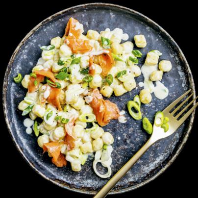 Émincer 4 oignons nouveaux. Réserver un peu de vert pour la finition, étuver le reste dans 2 cs d’huile d’olive. Ajouter 180 g de demi-crème et amener à ébullition. Entre-temps, cuire 750 g de gnocchis 2 min dans de l’eau salée bouillante. Les retirer de l’eau et les mettre encore dégoulinants dans la sauce. Au besoin, ajouter un peu d’eau de cuisson. Couper 300 g de truite saumonée fumée en lanières, les dresser avec les gnocchis et parsemer de l’oignon nouveau réservé.