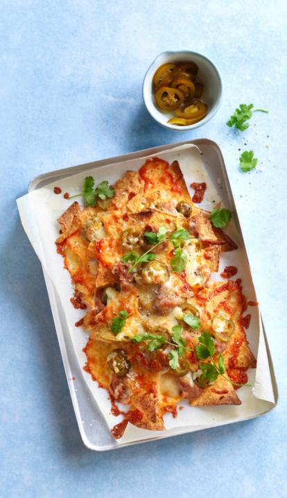 Backofen auf 200 °C Unter-/Oberhitze vorheizen. 250 g Tortilla-Chips, 1 Dose Bohnenpüree (440 g) und 60 g geschnittene Jalapeños auf ein mit Backpapier belegtes Blech verteilen. 250 g Tex-Mex-Reibkäse darüberstreuen, mit Salz und Pfeffer würzen. In der oberen Ofenhälfte 8–10 Minuten überbacken. Mehr Tortilla-Rezepte auf migusto.ch