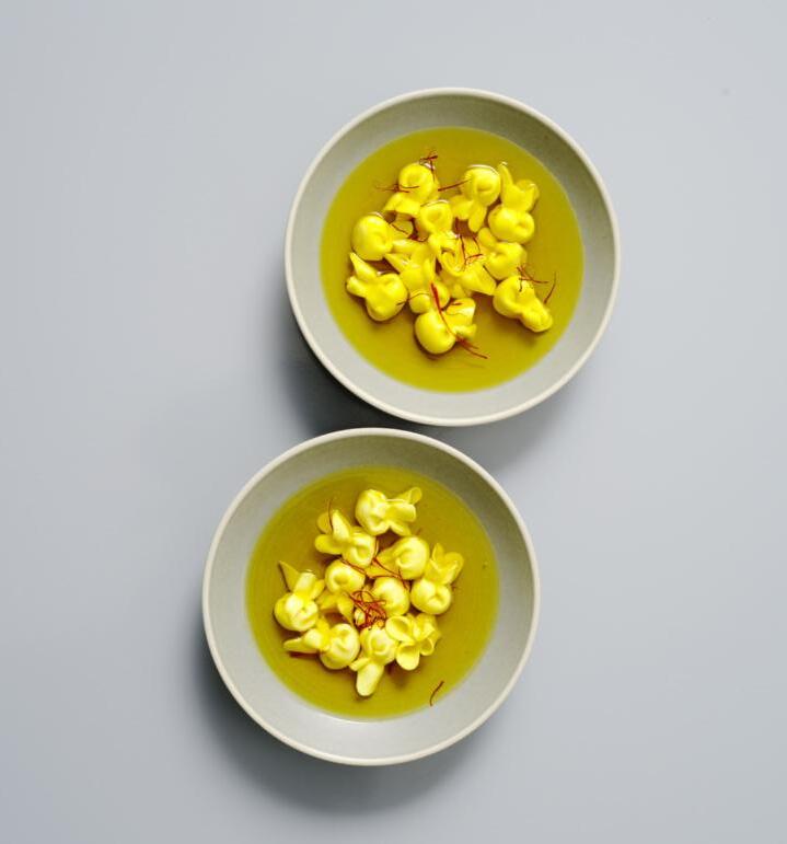 Chauffer 1 l de bouillon de légumes et le saler. Incorporer 0,3 g de brins de safran puis ajouter 250 g de tortellini. Laisser mijoter env. 3 min. Dresser et servir.