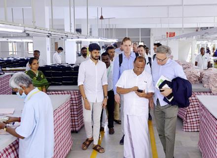 Sundar Murthy (vorn Mitte) führt Mario Irminger durch seine Textilfabrik.