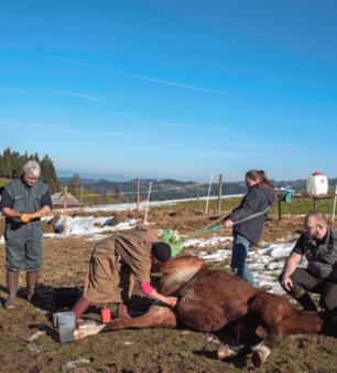 Varinos Glieder werden schwer. Immer tiefer sinkt der Kopf des einjährigen Freiberger-Hengsts. Dann knickt er ein und fällt seitwärts auf die noch teilweise schneebedeckte Weide mit Weitblick übers Emmental. Daniel Weibel hält das Pferd fest am Halfter, damit es sich beim Sturz nicht den Kopf anstösst. Als es auf der Seite liegt, legt er ihm ein Tuch über die Augen – und macht sich an die Arbeit.