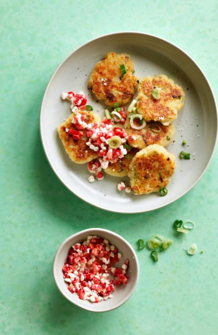 Couper 2 oignons nouveaux en rondelles, en réserver quelques-unes pour la présentation. Mélanger le reste des oignons avec 400 g de cottage cheese et environ 220 g de farine pour obtenir une pâte humide, saler et poivrer. Les mains farinées, former des petites galettes. Les faire dorer à feu moyen dans l’huile en procédant par portions. Entre-temps, couper 1 poivron en petits dés et les mélanger avec le reste du cottage cheese, saler et poivrer. Servir les galettes avec le cottage cheese aux poivrons. Plus de recettes sur migusto.ch