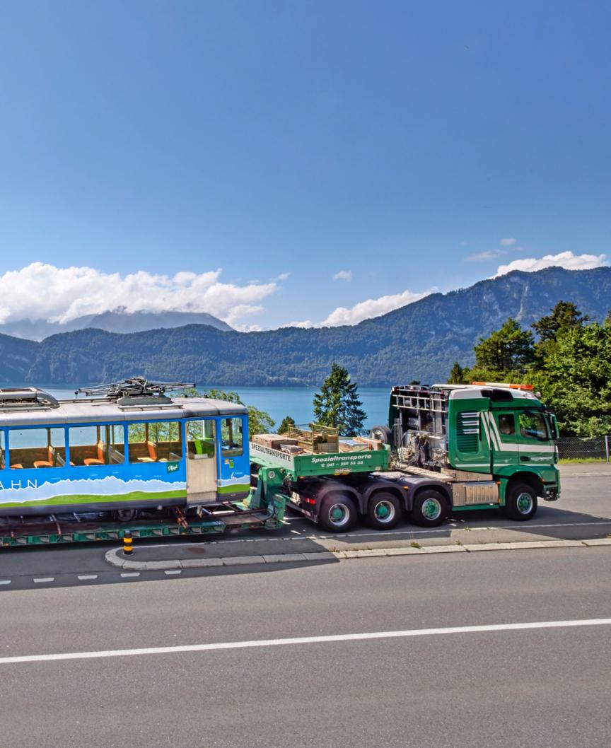 Migros-Moment in Weggis LU Ein alter «Aus der Region»Triebwagen der Zahnradbahn Vitznau–Rigi Kulm wird von einem Lkw transportiert. Der ausrangierte Wagen ist auf dem Weg zum neuen Besitzer, einem privaten Bahnfan. Im Hintergrund ist der Vierwaldstättersee zu sehen. Die Aufnahme ist am 10. Juni 2022 entstanden.