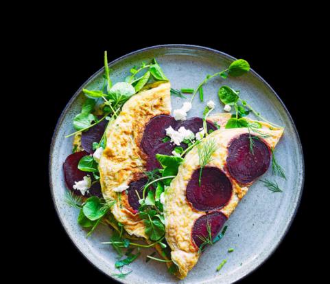 2 EL Olivenöl in einer beschichteten Bratpfanne erhitzen. Einige Randenscheiben in die Pfanne legen. ¼ der Eiermasse dazugeben und bei mittlerer Hitze ca. 2 Minuten braten. Omelette zusammenfalten, im Backofen warmhalten. Drei weitere Omeletten braten. Dann alle mit 20 g Rucola und restlichen Randen füllen. Gemischte Kräuter und 80 g Ziegenfrischkäse darüberbröseln. Rezept auf migusto.ch