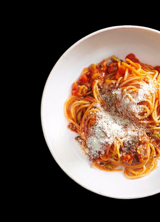 Der Pasta-Klassiker mit Hackfleisch und Tomaten kommt immer gut an und kann individuell verfeinert werden – zum Beispiel mit gehackten grünen Oliven. Rezepte auf migusto.ch
