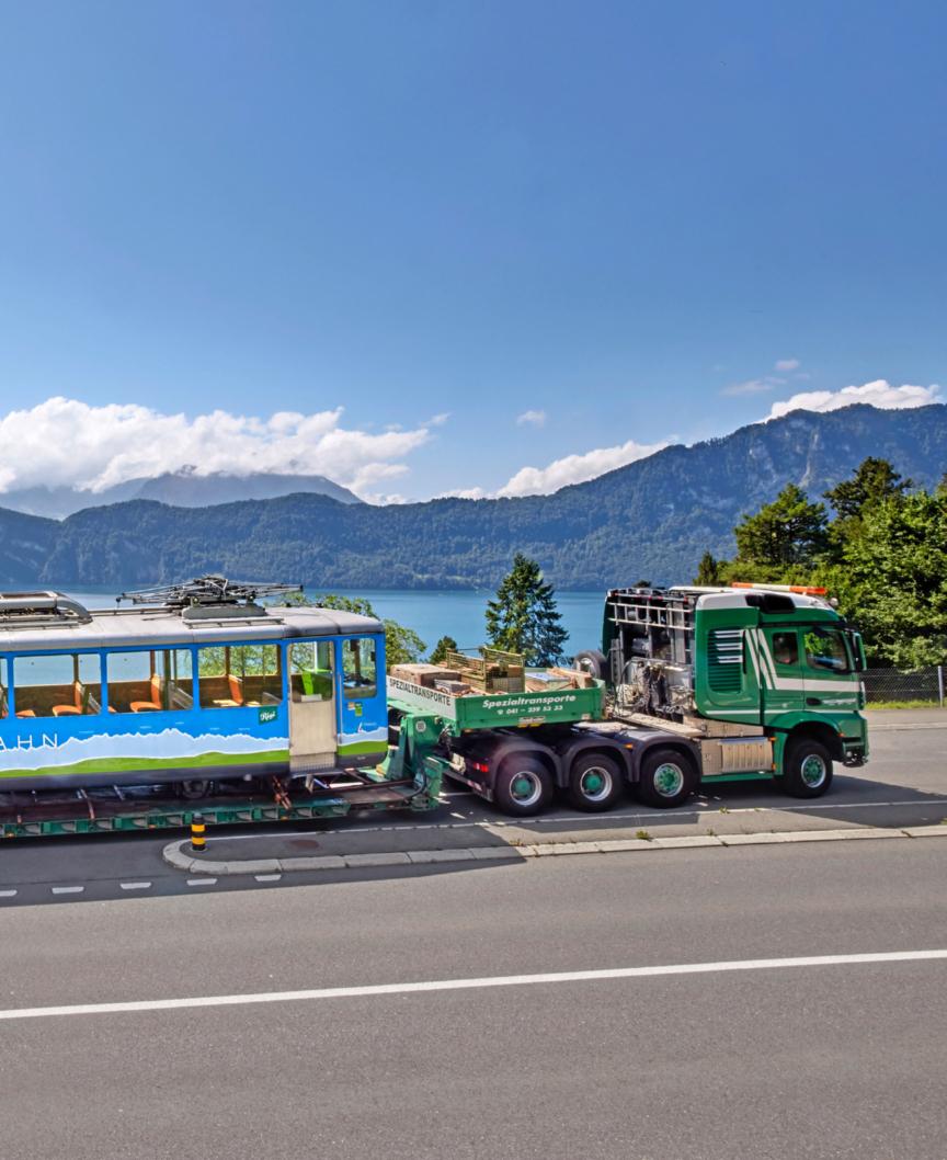 Le moment Migros Un ancien wagon «De la région.» hors d’usage du train à crémaillère Vitznau-Rigi est transporté par camion vers son nouveau propriétaire, un particulier fan de trains. En arrière-plan, on peut admirer le paysage idyllique du lac des Quatre-Cantons.