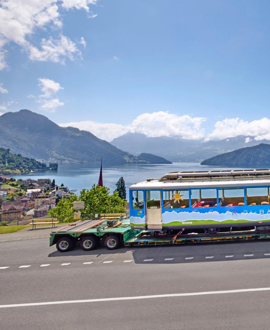 Le moment Migros Un ancien wagon «De la région.» hors d’usage du train à crémaillère Vitznau-Rigi est transporté par camion vers son nouveau propriétaire, un particulier fan de trains. En arrière-plan, on peut admirer le paysage idyllique du lac des Quatre-Cantons.