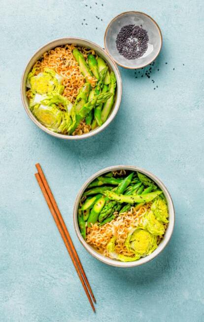 500 g grüne Spargeln im unteren Drittel schälen, Enden frisch anschneiden. Spargeln und 2 Mini-Lattiche in Stücke schneiden. 1,3 l Wasser aufkochen, Spargeln und den separat verpackten Inhalt von 4 Packungen Instant-Nudelsuppe mit Gemüsegeschmack ohne die Nudeln hineingeben. 2 Minuten kochen lassen, Pfanne vom Herd ziehen. Nudeln dazugeben und ca. 3 Minuten ziehen lassen. Mit MiniLattich anrichten. Nach Belieben mit 2 EL gerösteten Sesamsamen bestreuen. Mehr Suppenrezepte auf migusto.ch