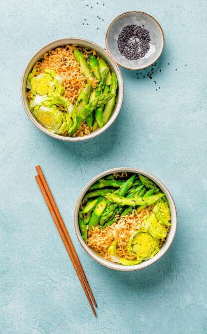 Peler le tiers inférieur des 500 g d’asperges et couper la base des tiges. Les détailler en morceaux. Procéder de même avec deux mini-laitues. Amener 1,3 l d’eau à ébullition, ajouter les asperges et le contenu de 4 sachets de soupe emballés séparément, mais pas les nouilles. Faire mijoter env. 2 min, retirer du feu, ajouter alors les nouilles et laisser reposer env. 3 min. Dresser avec les mini-laitues et, selon les goûts, parsemer de graines de sésame.