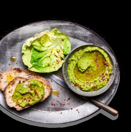 KOPFSALAT-HUMMUS Kichererbsen abgiessen und mit kaltem Wasser abspülen. 120 g Kopfsalatblätter hacken. Beides mit 60 g Olivenöl und 2 Knoblauchzehen pürieren. Hummus mit Salz abschmecken und mit 1 TL Cayennepfeffer bestreuen. Rezept für sechs Personen (Apéro) auf migusto.ch