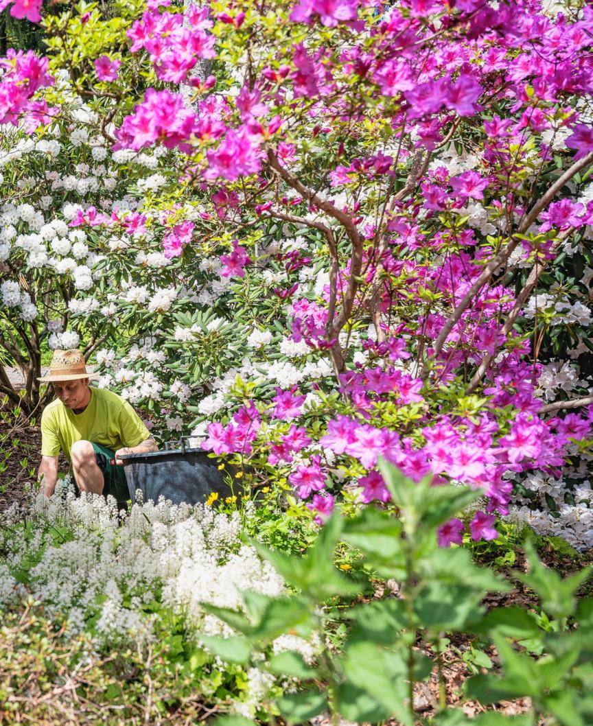 Migros-Moment bei Rifferswil ZH Im Park Seleger Moor pflegt Staudengärtner Torsten Ritzert bodendeckende Pflanzen zwischen blühenden Rhododendren. Die Migros Zürich ist Partnerin der «Seleger Moor Stiftung». Das Bild wurde am 10. Mai 2022 aufgenommen.