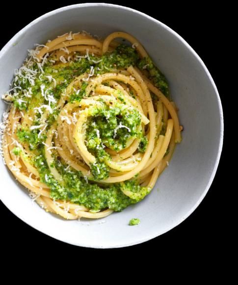 Morceler 50 g de parmesan. Râper fin le zeste d’un citron puis exprimer le jus. Réduire le tout en purée avec 40 g de roquette, 1,2 dl d’huile d’olive, 50 g de pistaches, 2 gousses d’ail et le parmesan dans un robot ménager ou au mixeur-plongeur. Saler et poivrer. Servir avec des pâtes ou verser dans un bocal (2 dl) pour le conserver. La recette se trouve sur migusto.migros.ch