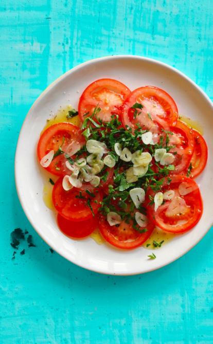800 g Tomaten in Scheiben schneiden. 2 Knoblauchzehen in feine Scheiben schneiden. ½ Bund Petersilie hacken. Tomaten mit Petersilie und Knoblauch anrichten. 4 EL Essig und 6 EL Öl mischen und mit Salz und Pfeffer abschmecken. Salat mit der Sauce beträufeln. Mehr Tomatenrezepte auf migusto.ch