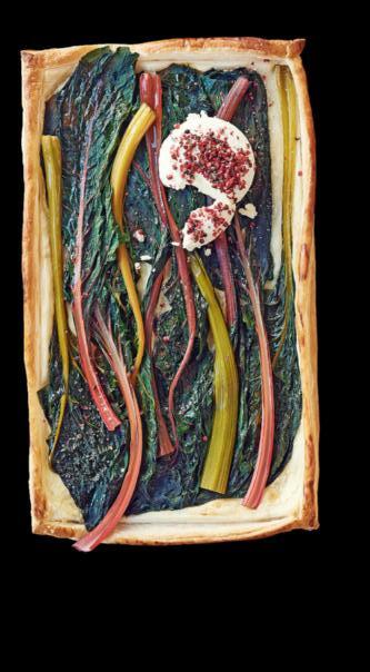 Für die kleine Mahlzeit und vier Personen 300 g ganze Krautstiele in Salzwasser ca. 2 Minuten blanchieren, herausheben. Auf ein Tuch legen und trocken tupfen. Den rechteckig ausgewallten Blätterteig samt Backpapier auf ein Backblech legen. Für den Rand Teig den Seiten entlang im Abstand von ca. 1 cm mit einem Messer einritzen, aber nicht durchschneiden. 3 EL Crème fraîche auf dem Teig verteilen, Rand frei lassen. Krautstiele dicht aneinander darauf auslegen. Teigrand mit Eigelb bepinseln. Die Tarte im vorgeheizten Ofen (220 °C) in der Ofenmitte ca. 15 Minuten backen. ½ TL rosa Pfeffer im Mörser leicht zerstossen. 150 g Ziegenfrischkäse im Pfeffer wenden und auf der Tarte anrichten.