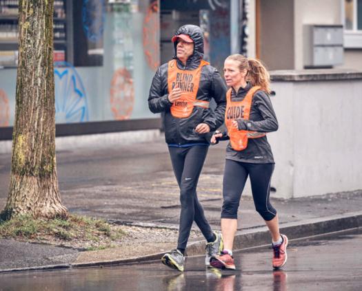 confiance dès le début. Elle fait vraiment attention et je peux me fier à ses instructions.» En tant que guide, Gisela Meier doit avoir un œil sur chaque bordure de trottoir, anticiper les obstacles et formuler clairement ses directives. Les deux collègues ont les mains reliées par un ruban élastique. «Mais il m’arrive aussi de courir sans le ruban élastique. Je me concentre alors uniquement sur le bruit des pas de Gisela et je peux courir à