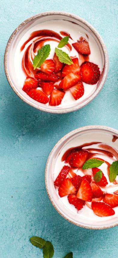 Couper 300 g de fraises en petits morceaux, en réserver un peu pour la finition, mélanger le reste à 600 g de lait acidulé (M-Dessert) avec 4 cs de topping aux fraises. Garnir des morceaux de fruits réservés et, selon les goûts, d’un peu de menthe.