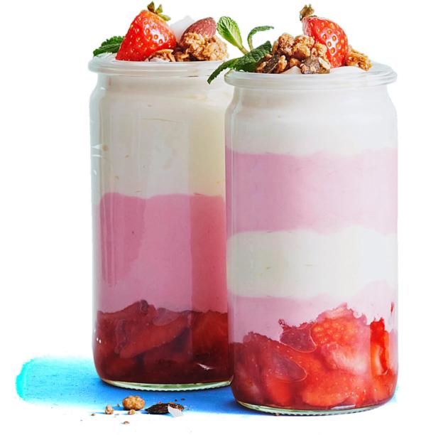 Couper 500 g de fraises en petits morceaux. Mélanger la moitié avec un peu de sirop de fleurs de sureau, répartir dans 4 verrines d’environ 3 dl. Écraser le reste des fraises à la fourchette. Mélanger 600 g de séré à la crème avec un peu moins de 1 dl de sirop de fleurs de sureau. Incorporer 2 feuilles de gélatine préalablement trempées dans l’eau froide puis fondues à feu doux dans une casserole, fouetter. Incorporer 2,5 dl de crème entière fouettée. Mélanger la moitié de la mousse au séré avec les fraises écrasées et répartir dans les verrines, puis recouvrir avec le reste de mousse. Couvrir et laisser au frais pendant 4 heures. Décorer avec quelques fraises, du granola et de la menthe. La recette se trouve sur migusto.migros.ch