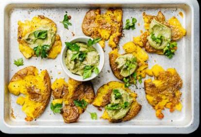 800 g kleine Kartoffeln ungeschält ca. 15 Minuten knapp gar kochen, abgiessen und auf ein mit Backpapier belegtes Blech legen. Mit einem Spatel etwas flach drücken. Mit 4 EL Olivenöl beträufeln, mit Salz und Pfeffer würzen. Backofen auf 200 °C Unter-/Oberhitze vorheizen. Kartoffeln in der Ofenmitte ca. 15 Minuten knusprig backen. Mit ½ Bund Kräutern (z. B. Koriander) bestreuen und mit 200 g Guacamole servieren. Rezept auf migusto.ch