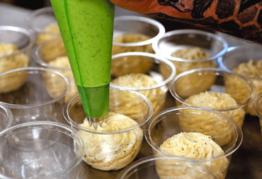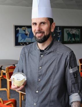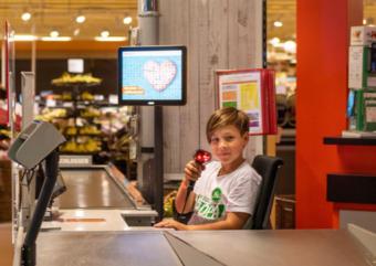 Migros-Moment in Romanel-sur-Lausanne VD Am FoodFörderband «V-Love-Train» können Kundinnen und Kunden pflanzliche Gerichte kosten. Promotionsmitarbeiterin Célestine Fuhrer bringt ein veganes Häppchen in Fahrt. Das Foto ist am 16. Mai in der Migros von Romanel-sur-Lausanne entstanden, in elf weiteren Filialen macht der «V-Love-Train» noch Station.