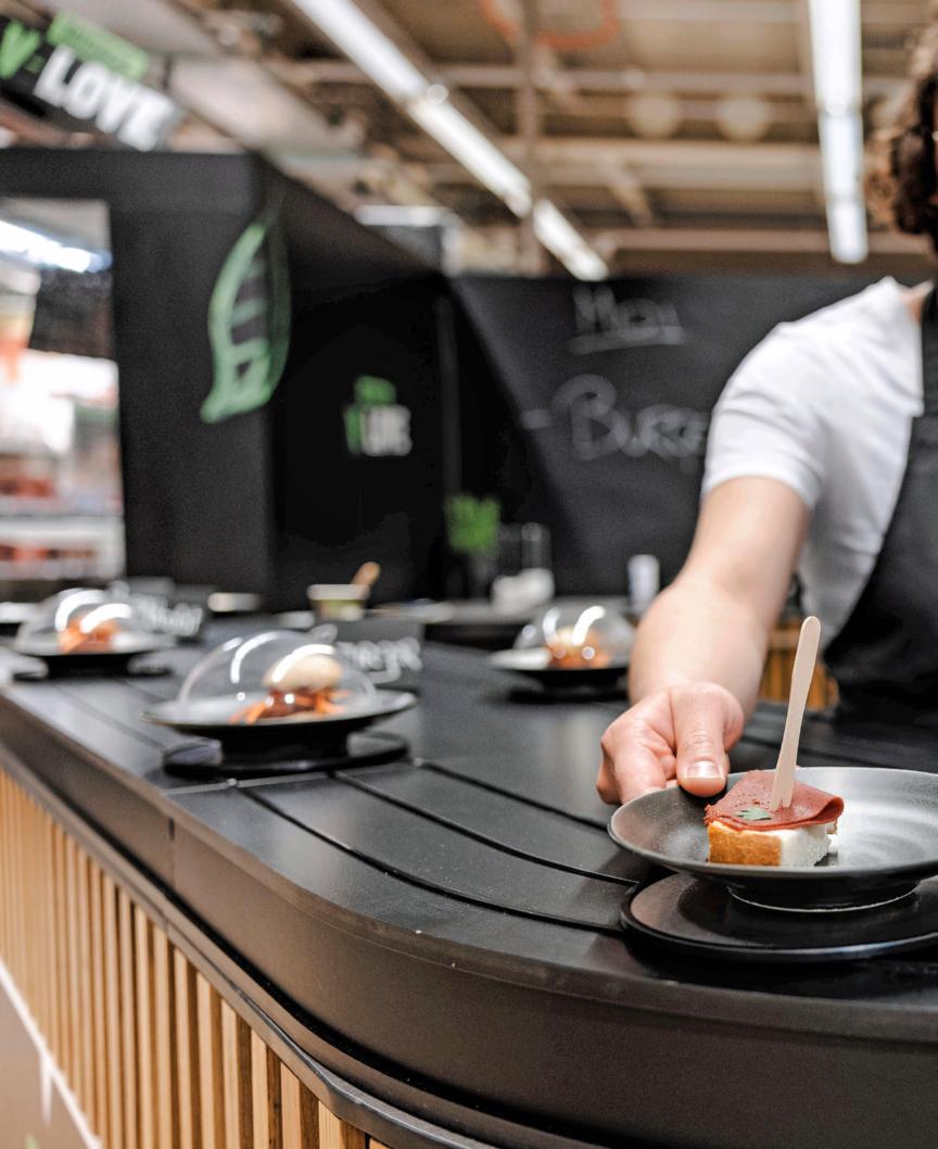 Migros-Moment in Romanel-sur-Lausanne VD Am FoodFörderband «V-Love-Train» können Kundinnen und Kunden pflanzliche Gerichte kosten. Promotionsmitarbeiterin Célestine Fuhrer bringt ein veganes Häppchen in Fahrt. Das Foto ist am 16. Mai in der Migros von Romanel-sur-Lausanne entstanden, in elf weiteren Filialen macht der «V-Love-Train» noch Station.