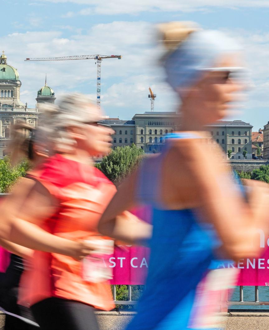 Migros-Moment in Bern Läuferinnen passieren die Monbijoubrücke mit Blick auf das Bundeshaus. Sie nehmen am Schweizer Frauenlauf Bern teil, der wie viele Volksläufe von der Migros unterstützt wird –und 2023 am kommenden Sonntag stattfindet. Die Aufnahme wurde am 12. Juni 2022 gemacht.