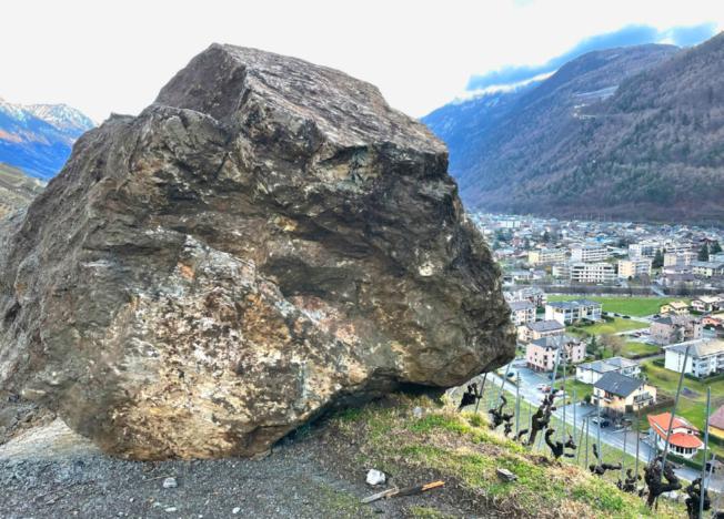 Désormais, il faut sécuriser celui qui a l’air de ne tenir qu’à un fil, et qui pourtant n’a pas bougé d’un millimètre, selon les mesures effectuées toutes les 10 minutes. Là aussi, un parepierres a été posé en contrebas et une station météo renseigne les services cantonaux sur d’éventuels dangers liés aux précipitations. Un détecteur de