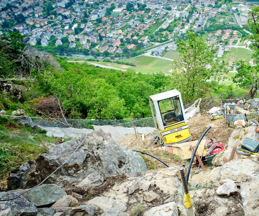 Pour eux, c’est un simple «talus». C’est ainsi que les spécialistes de MTM Maret, une entreprise spécialisée en travaux de génie civil en terrain difficile, nomment l’endroit. Pour le commun des mortels, le «talus» en question est tellement escarpé qu’il faut se tenir à une corde pour y accéder. Avec câbles, tiges et filets en métal fixés dans le sol avec du béton, l’équipe est en train de sécuriser un rocher – pour que la presque catastrophe du 15 mars ne se reproduise pas.