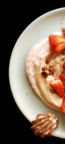 Réduire 125 g de fraises en purée avec 1 cs de sirop (p. ex. érable ou de fleurs de sureau). Remuer 250 g de Qimiq jusqu’à consistance lisse puis le mélanger au coulis de fraises. Dresser la crème aux fraises avec 200 g de yogourt (p. ex. chocolat) et mélanger de façon à obtenir de légères marbrures. Trancher 125 g de fraises et émietter 100 g de biscuits (p. ex. pattes d’ours) puis en garnir le dessert.