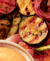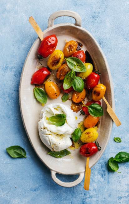 Grill auf 200 °C vorheizen. 400 g bunte Cherrytomaten auf 8 Spiesse stecken. Mit etwas Olivenöl bestreichen und mit Fleur de sel würzen. Spiesse kurz auf beiden Seiten grillieren. 4 Mozzarellas di bufala auf Teller verteilen, etwas einreissen. Tomatenspiesse dazulegen.