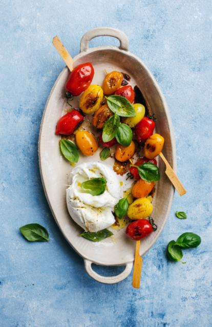 Préchauffer le gril à 200 °C. Piquer 400 g de tomates cerises sur des brochettes puis les badigeonner d’un peu d’huile et les saler. Griller les brochettes brièvement des deux côtés. Dresser quatre mozzarellas sur des assiettes et les ouvrir un peu. Ajouter les brochettes de tomates puis arroser le tout d’environ 6 cs d’huile d’olive et d’environ 4 cs de vinaigre balsamique. Assaisonner de sel et de poivre. Effeuiller un demibouquet de basilic par-dessus et servir aussitôt. Plus de recettes sur migusto.ch