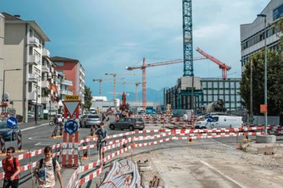 Dès la gare de Renens (VD) et ses cinq quais rallongés, le goudron colle encore aux semelles. Terminée en 2020, après cinq ans de lourds travaux, la rénovation de la septième plus importante gare de Suisse romande sent encore le neuf. À l’instar du Rayon Vert, large passerelle végétalisée au-dessus des voies, qui a été inauguré dans la foulée. Mais dès que l’on rejoint la rue de Lausanne, on entre dans le vif du chantier: poussière, gravats le long des rails et secousses de pelles mécaniques, tandis qu’au loin se dresse une forêt de grues.