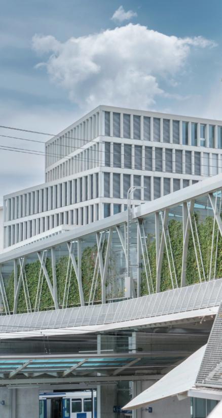 Longue de 150 m, la passerelle végétalisée Rayon Vert relie directement les quais ainsi que les places nord et sud de la gare de Renens.