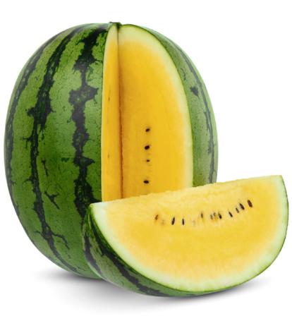 De l’extérieur, elle ressemble à n’importe quelle pastèque. Mais son intérieur cache une belle surprise, à savoir une chair couleur soleil. Cette pastèque jaune présente un goût moins sucré que sa sœur rouge et rappelle le concombre.
