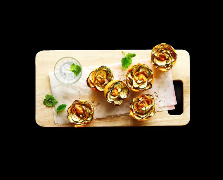 Préchauffer le four à 180 °C, chaleur tournante. Beurrer les moules. Détailler 1 courgette en rondelles d’env. 2 mm d’épaisseur et les saler. Dérouler 1 abaisse rectangulaire de pâte feuilletée (320 g) et y étaler 120 g de pesto rouge. Partager la pâte dans la longueur en 6 bandes de largeur égale. Disposer les courgettes sur la moitié supérieure des bandes de pâte en les faisant se chevaucher légèrement, puis les recouvrir avec la moitié inférieure de la pâte et enrouler pour former une «rose». Déposer dans des moules à muffins ou à brioches de 6 cm de diamètre et cuire env. 35 min au milieu du four. Démouler et servir. La recette se trouve sur migusto.migros.ch