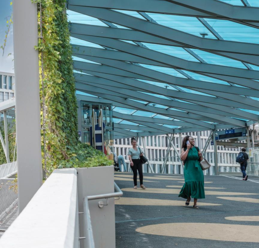 Longue de 150 m, la passerelle végétalisée Rayon Vert relie directement les quais ainsi que les places nord et sud de la gare de Renens.