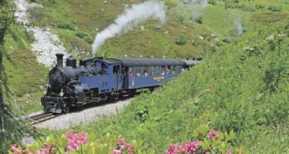 Alpenrösli. C’est à Gletsch que débute ensuite notre aventure ferroviaire et il est impressionnant de voir le petit train à vapeur rénové avec tant d’amour gravir la spectaculaire ligne sommitale de la Furka, en route pour Realp! Après une courte promenade et un arrêt à Realp, nous prenons le train régional pour Oberwald, où notre car nous attend pour nous ramener à notre point de départ.