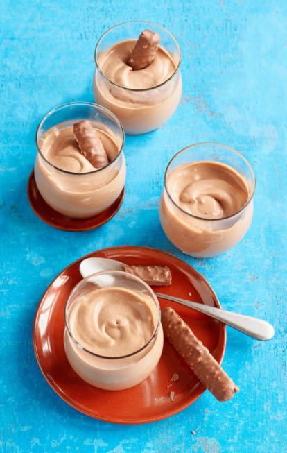 De 2 dl de crème, en réserver 1 dl au réfrigérateur et chauffer légèrement le reste dans une petite casserole. Hacher grossièrement 4 branches de chocolat et les faire fondre dans la crème. Laisser refroidir. Fouetter la crème réservée et l’incorporer par portions à la crème chocolatée. Répartir dans des verres et faire prendre 2 h au réfrigérateur. Partager 2 branches de chocolat en deux et en piquer une moitié dans chaque mousse. Plus de recettes avec du chocolat sur migusto.ch