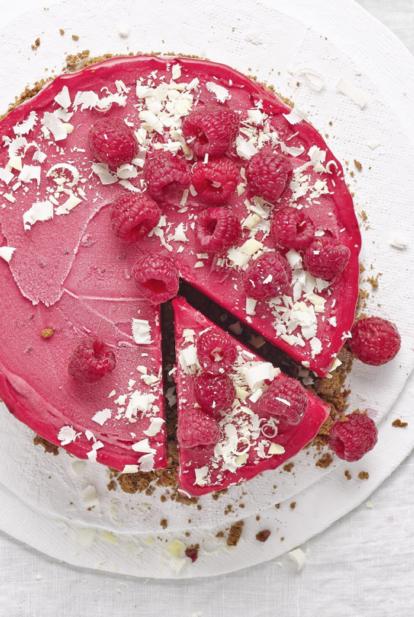 Chemiser le fond d’un moule à charnière (Ø 18 cm) de papier sulfurisé. Placer 200 g d’amaretti dans un sachet de congélation et les émietter finement avec un rouleau à pâte. Faire fondre 2 cs de sorbet à la framboise, les mélanger aux miettes d’amaretti, en tapisser le fond du moule et bien tasser. Répartir 9 dl de sorbet dessus, lisser et placer 2 h au congélateur. À l’aide d’un couteau, raboter env. 20 g. de copeaux de chocolat blanc sur une assiette et la réserver au congélateur. Avant de servir, démouler la tourte et la décorer de framboises et de copeaux de chocolat. Plus de recettes de tourtes sur migusto.ch