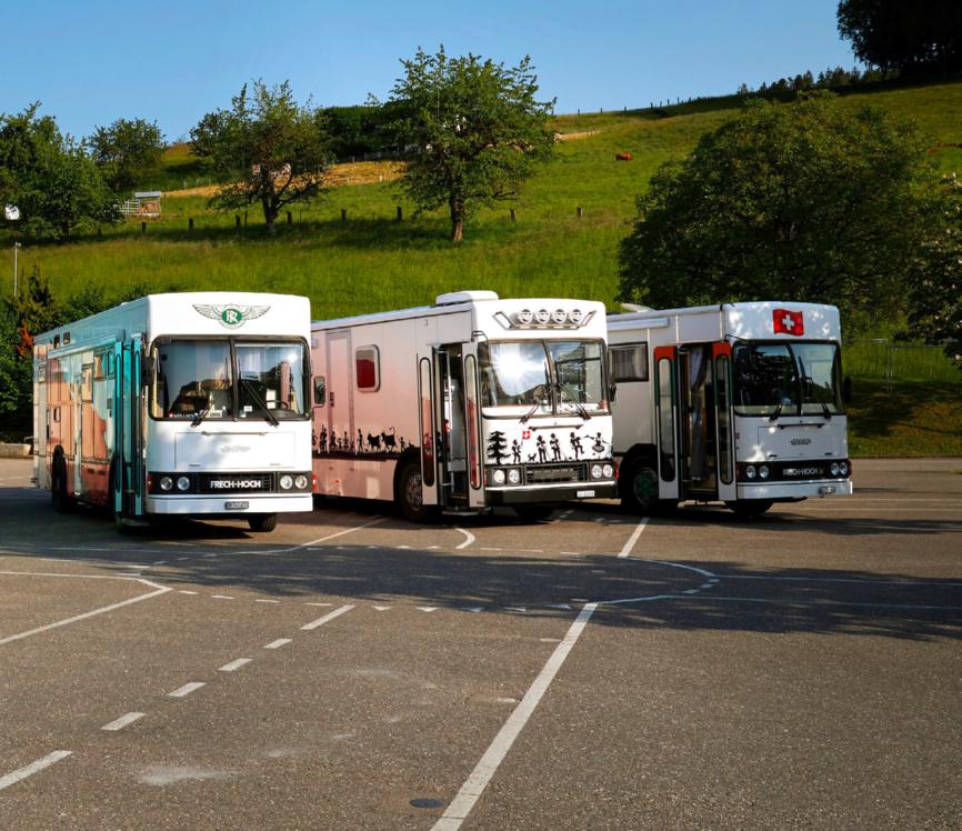 Fünf Aficionados zeigen ihre alten Migros-Verkaufswagen, die sie zu Wohnmobilen umgebaut haben