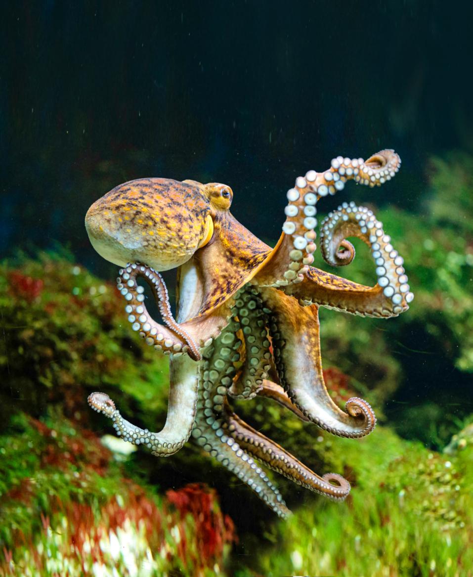 Les poulpes communs ne vivent que trois ou quatre ans, mais ils apprennent énormément durant cette courte période. L’un d’entre eux vit au zoo de Bâle. «En fait, un poulpe a neuf cerveaux», dit le soigneur animalier André Jünger, 43 ans. «Dans la tête, et dans chacun des huit tentacules, il y a un système nerveux. C’est presque comme si chaque tentacule avait sa propre vie.» Pour que le poulpe ne s’ennuie pas, André Jünger lui confie des tâches délicates: il remplit avec de délicieux morceaux de poisson des petits pots de yogourt dotés d’un couvercle à pince ou des récipients en plastique munis d’un bouchon à vis. L’animal comprend rapidement comment les couvercles s’ouvrent. Et comment le poulpe se détend-il? «Sur un iPad, nous lui montrons des vidéos qu’il suit attentivement à travers la vitre de l’aquarium», explique André Jünger. «Il regarde des matchs de hockey ou des dessins animés de Bob l’éponge.»