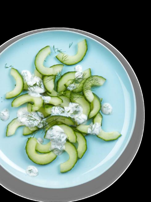 Partager 2 concombres en deux dans la longueur puis les couper en tranches. Hacher 1 bouquet d’aneth. Mélanger l’aneth, 2 cs de vinaigre de vin blanc et 150 g de yogourt nature. Ajouter le concombre et mélanger. Relever de sel et de poivre. La recette se trouve sur migusto.migros.ch