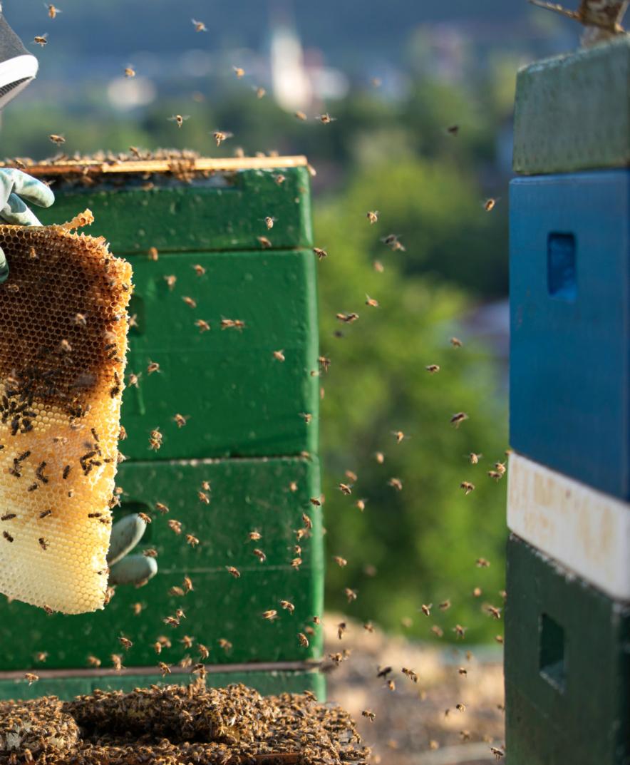 Migros-Moment in Zürich Die Imkerin Mirjam Lendenmann kümmert sich auf dem Dach des Migros-Hochhauses am Limmatplatz um ihre Bienenvölker und produziert mitten in der Stadt Honig für das Personalrestaurant Guggi. Das Bild entstand im Juni 2019.