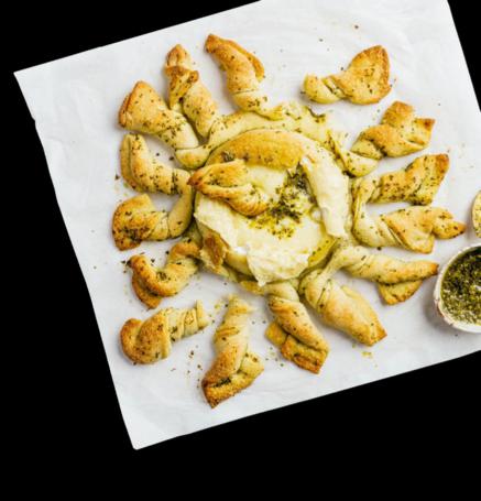 Backofen auf 200 °C Umluft vorheizen. Für vier Personen 3 EL Pesto mit 3 EL Öl mischen. Einen rund ausgewallten Pizzateig (à 260 g) auf ein mit Backpapier belegtes Blech legen, 240 g Camenbert in die Mitte legen, den Teig mit wenig Wasser bestreichen. Den zweiten Pizzateig darauflegen und gut andrücken. Teig rund um den Käse strahlenförmig in 16 Stränge schneiden. Jeweils zwei Stränge nach aussen verdrehen. Rundum mit Pesto bestreichen. In der unteren Ofenhälfte ca. 25 Minuten backen. Mit restlichem PestoÖl servieren. Das Rezept gibts auf migusto.ch