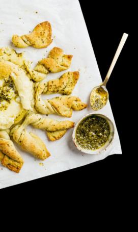 Préchauffer le four à 200 °C, chaleur tournante. Mélanger 3 cs de pesto et 3 cs d’huile. Dérouler 1 abaisse ronde de pâte à pizza (260 g) sur une plaque chemisée de papier sulfurisé. Déposer le 1 camembert de 240 g au centre, badigeonner la pâte avec un peu d’eau, recouvrir avec une deuxième abaisse de pâte et bien appuyer. Découper la pâte tout autour du fromage en 16 bandes (façon rayons de soleil) et les torsader en les tournant vers l’extérieur. Badigeonner de pesto. Glisser au four et cuire env. 25 min. Servir avec le reste de pesto. La recette se trouve sur migusto.migros.ch