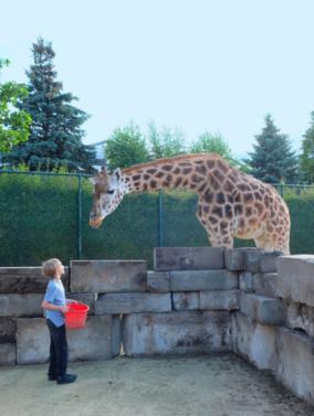 Dann lichtet sich der Himmel, und zwei Giraffen spazieren direkt an unserem Fenster vorbei. Eine Steinmauer trennt uns zwar von den Giraffen, aber Bobo, der Boss im Giraffenhaus, streckt neugierig seinen langen Hals zu uns hinüber. Er weiss wohl bereits, dass bei uns ein Eimer mit Futter steht. Wir gehen nach draussen und strecken ihm eine Handvoll Pellets hin, die er mit seiner warmen Zunge ganz sanft aus der Hand leckt. Aber Achtung, jetzt läuft ihm das Wasser im Mund zusammen! Seine Speichelfäden sind fast so lang wie sein Hals.
