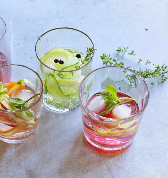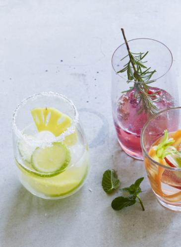 Romarin, carottes, ananas et concombre plongent dans les verres pour une hydratation stylée.