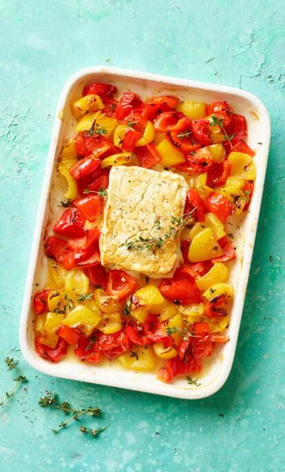 2 Knoblauchzehen dazupressen. Von 4 Thymianzweigen die Blättchen dazuzupfen, 6 EL Olivenöl dazugiessen. Mit Salz und Pfeffer würzen und mischen. 200 g Feta in der Peperonimarinade wenden und dazulegen. In der Ofenmitte ca. 20 Minuten braten.