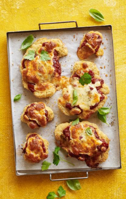 Backofen auf 200 °C Umluft vorheizen. 1 grossen Blumenkohl à ca. 800 g samt Strunk in 1,5 cm dicke Scheiben schneiden, mit Salz würzen, mit ca. 1 dl Olivenöl bestreichen. In ca. 100 g Paniermehl wenden, Paniermehl etwas andrücken und Blumenkohlscheiben auf ein mit Backpapier belegtes Blech legen. In der Ofenmitte ca. 15 Minuten backen. Ca. 300 g Tomatensauce und 150 g geriebenen Mozzarella darauf verteilen. Ca. 10 Minuten fertig backen. Mit Pfeffer bestreut servieren. Mehr Blumenkohlrezepte auf migusto.ch