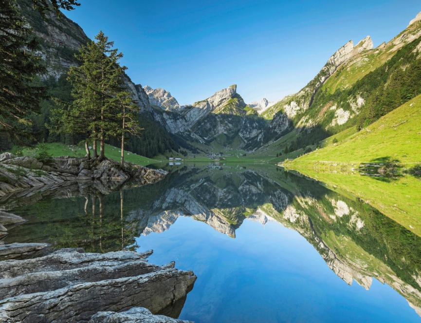 Hier bleibts spannend bis zum Schluss: Das Hinterburgseeli sieht man erst, wenn man kurz davorsteht. Das Gewässer liegt in einer Senke. Auf der Wasseroberfläche spiegeln sich die Tannen und die wuchtige Felswand, die den See auf einer Seite begrenzt.