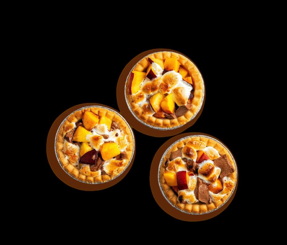 Partager deux fruits (p. ex. pêche, nectarine ou poire) par la moitié et les détailler non épluchés en dés. Couper 50 g de chocolat et 8 guimauves en morceaux. Disposer le tout par couches dans 4 fonds de tartelettes. Déposer les tartelettes dans des moules en aluminium sur la grille. Les couvrir avec une casserole réfractaire retournée ou avec une feuille d’aluminium. Les faire chauffer 5-7 min à env. 150 °C, jusqu’à ce que le chocolat soit fondu. À noter que ces tartelettes peuvent aussi se préparer au four.